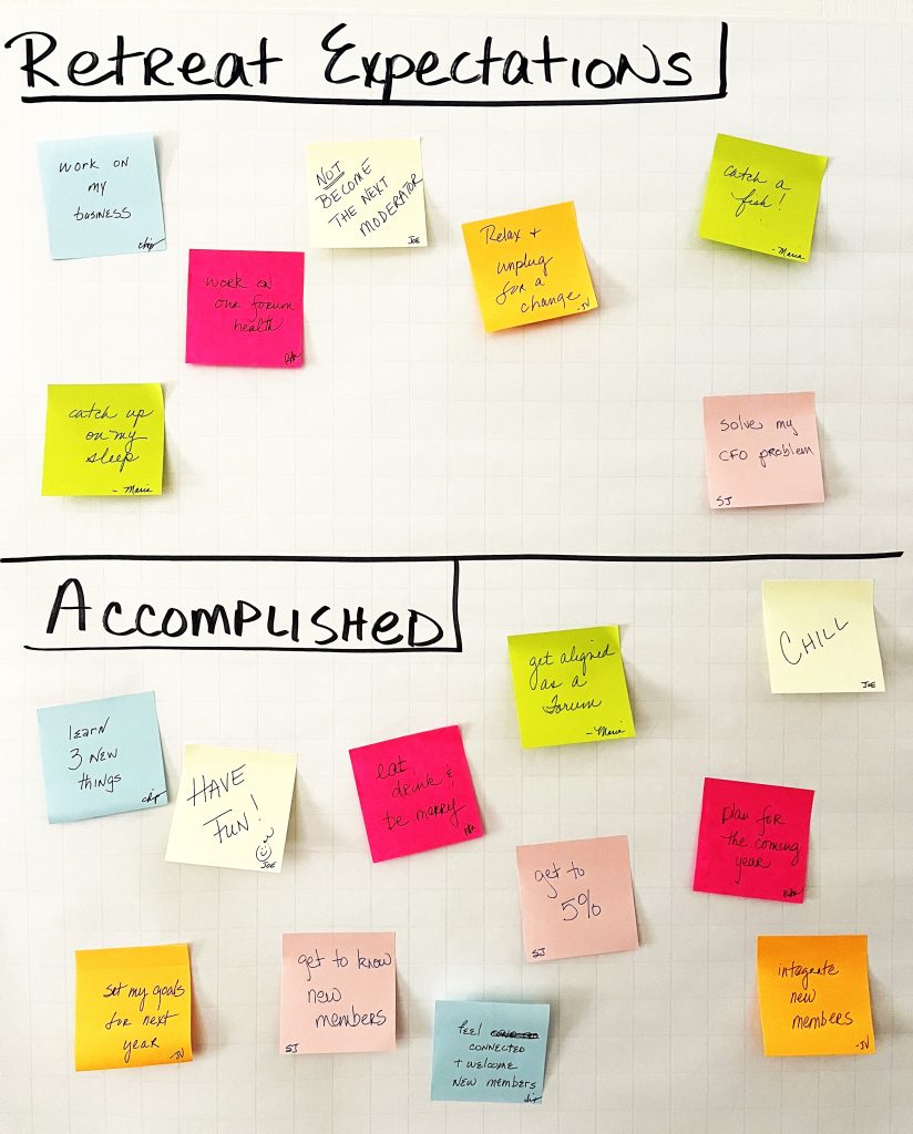 An interactive way to identify retreat goals and keep track of which ones are accomplished throughout the retreat.